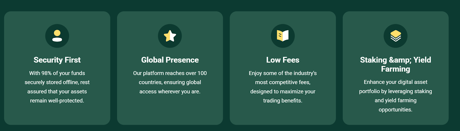 Компания активно рассказывает о своей методике безопасности. Около 98% активов хранятся в холодных кошельках. Встроена программа Security Bounty для обнаружения уязвимостей. Поддерживается двухфакторная аутентификации и KYC.