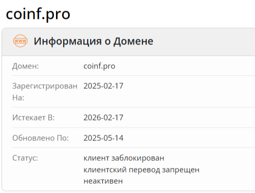 Домен coinf pro был зарегистрирован 17 февраля 2025 года. Площадка для торговли на этом сайте стала заменой «вышедшей в тираж» из-за постоянных жалоб пользователей биржи, размещенной на портале coina pro. На момент обзора проект «Коинф» также прекратил свое существование. Жизнь фейковых криптобирж очень коротка.