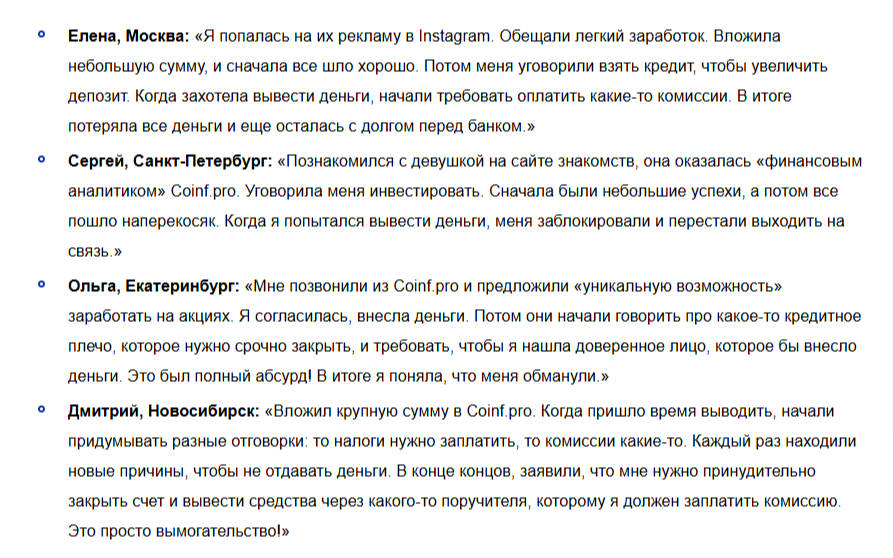 Создатели торговой площадки с помощью агрессивной рекламы в соцсетях активно продвигали преимущества своего проекта. Однако все плюсы биржи Coinf оказались фейком. Об этом говорит отсутствие положительных отзывов в интернете.