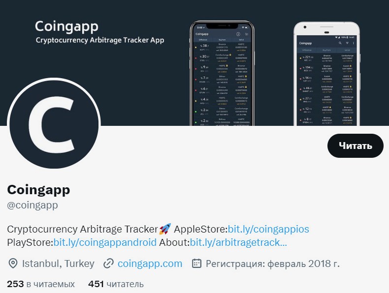 В довесок к приложению Coingapp идет Twitter-аккаунт проекта (@coingapp), где на момент обзора собралось 450 подписчиков. В описании профиля все еще болтаются ссылки на уже почивший сайт и на мобильные приложения. Местом дислокации офиса компании значится Стамбул, Турция, а дата регистрации – аж февраль 2018 года.