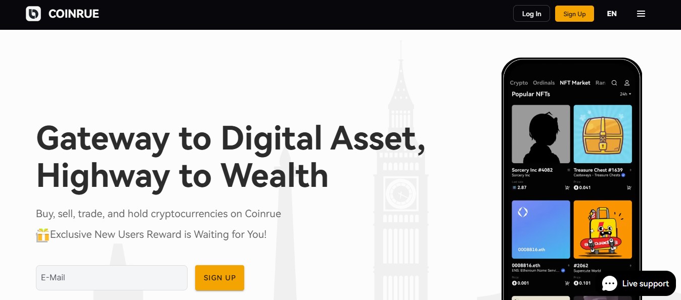 Визуально coinrue com очень похожа на обычную криптовалютную биржу. Нам предлагают регистрацию без обязательных KYC-верификаций, чтобы тут же покупать/продавать и хранить BTC и самые ходовые альты. В рекламных материалах админы делают упор на удобство интерфейса, скорость транзакций и общую надежность системы.