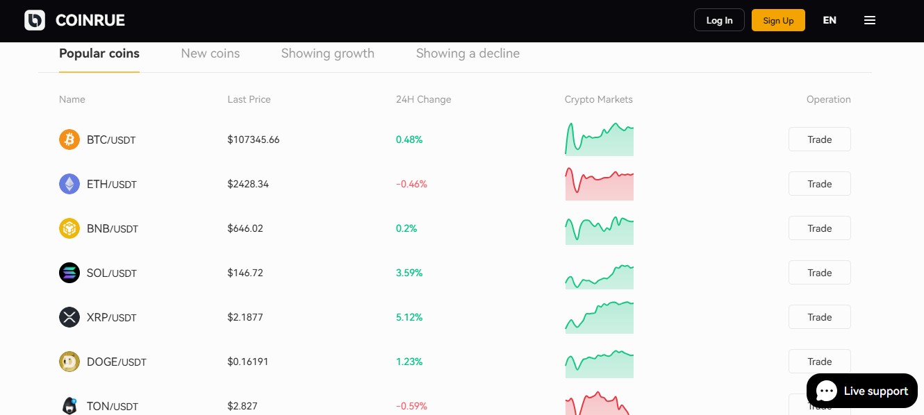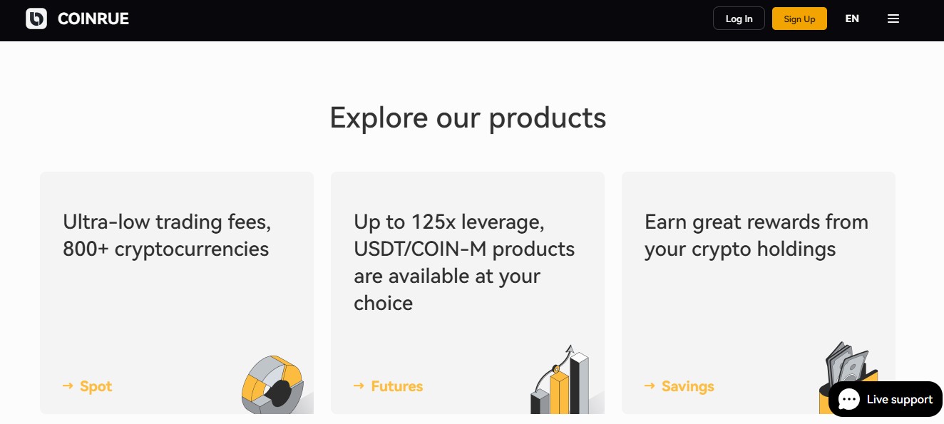 Чтобы выглядеть как полноценная топ-биржа, coinrue com рассказывает о поддержке всех возможных вариантов трейдинга. Клиентам обещают доступ к спотовому рынку для прямой покупки и продажи крипты, а также к маржинальной торговле и фьючам для любителей поиграть на понижение или взять большое плечо. Кроме того, на площадке якобы есть раздел P2P-обмена, где пользователи могут торговать напрямую друг с другом. Для долгосрочных держателей, или «ходлеров», даже предусмотрена опция стейкинга. Якобы на coinrue com можно без проблем получать пассивный доход, закинув свои монеты в специальный пул ликвидности.