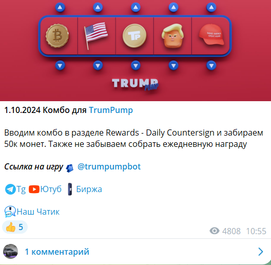 Торговые сигналы или комбо-сигналы. Combo Tap регулярно публикует сигналы по различным криптовалютам. Они часто подаются в виде «комбо» — особого формата, где используются уровни входа, цели и стопы, но завуалированы под «коды». Вместо слов «вход», «тейк» или «стоп» используются слова вроде Код, Загадка, Ребус, Шифр, Ключ и т.д.