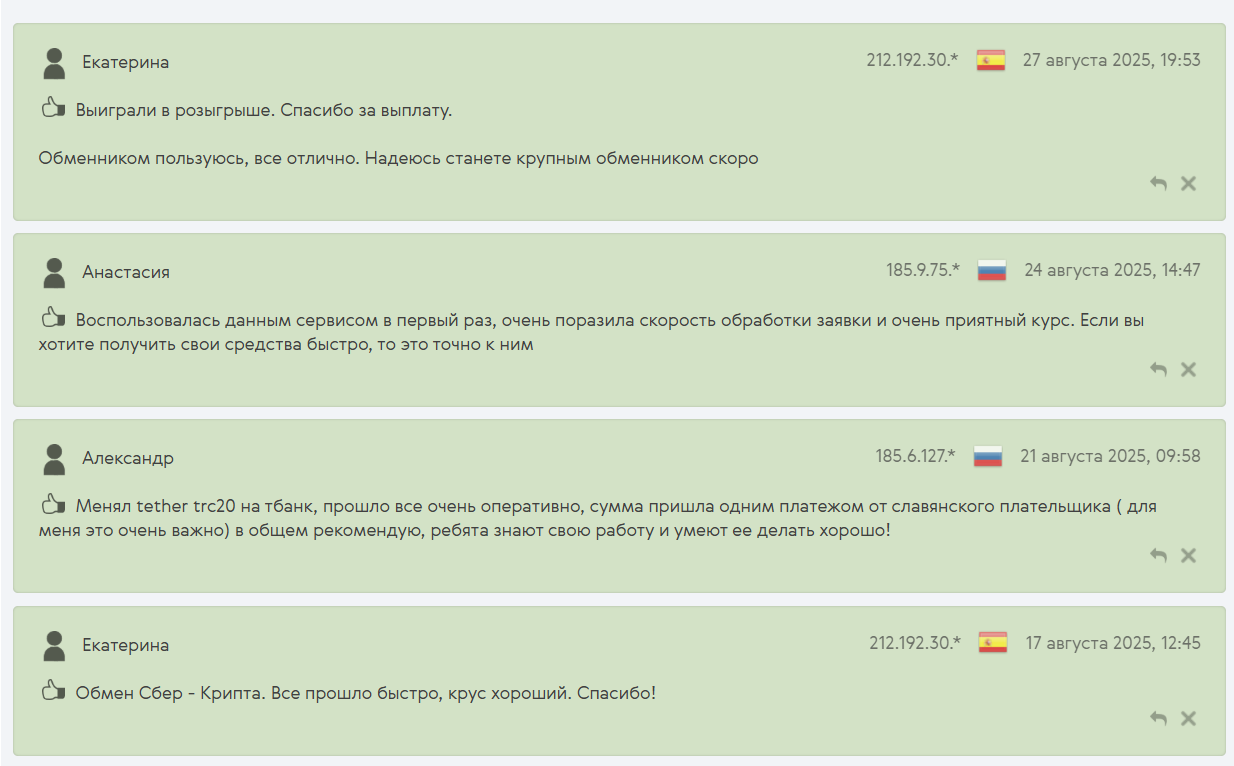 - 100% гарантия обмена. Резервы сервиса регулярно пополняются, так что перебоев в транзакциях не бывает;