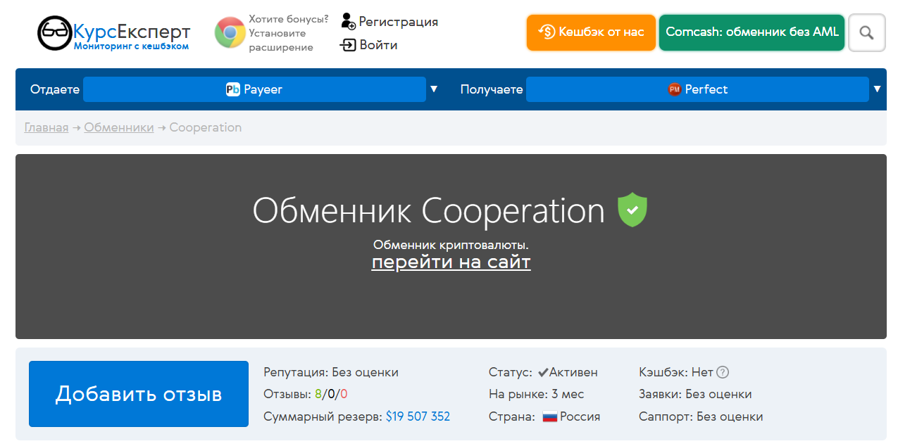 Cooperation сотрудничает с несколькими мониторингами. Мы проверили рейтинг сервиса на «КурсЭксперте». Обменник здесь находится в зеленой зоне. Репутации сервиса мониторинг еще оценки не дал, но зато есть положительные отклики от пользователей. Жалоб или финансовых претензий к обменнику нет.