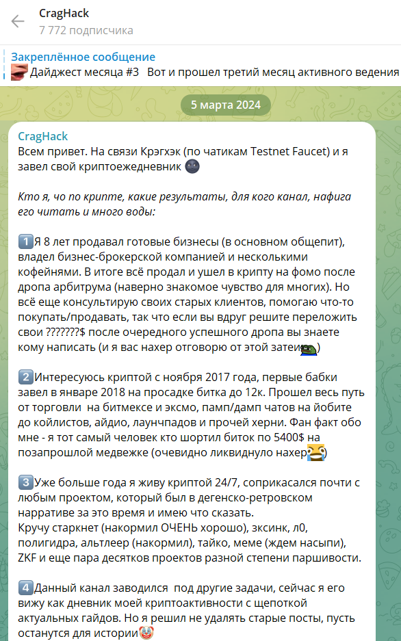 Телеграмм-канал про криптоновости, который ведёт Александр Трифонов – CragHack Crypto существует с 2023 года. В обзоре проанализируем публикуемый контент и активность подписчиков.