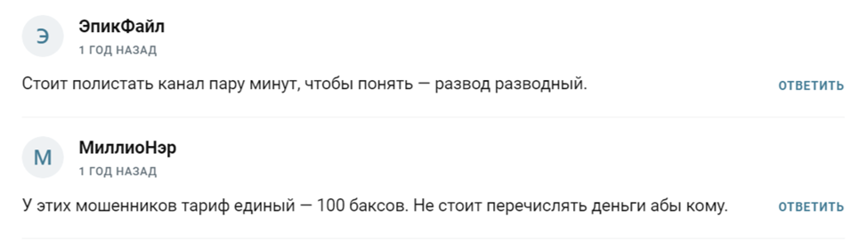 Причем подобные отзывы не единичны. Некоторые пользователи уверены, что плата в 100 $ — заезженное и типичное условие недобросовестных проектов. После внесения средств трейдер мгновенно блокирует клиента. Часть подписчиков уверена, что достаточно немного изучить ленту тг-канала, чтобы понять очевидные вещи:
