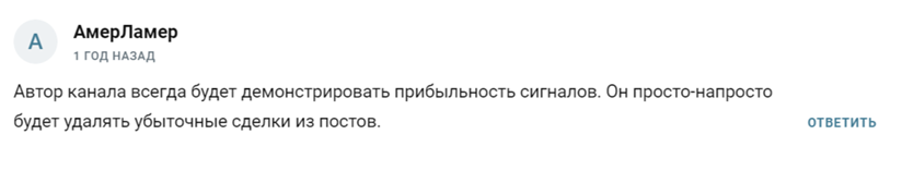 Еще один пользователь уверен, что в тг-канале намеренно демонстрируются только прибыльные сделки. А информация об убытках либо предусмотрительно замалчивается, либо быстренько стирается.