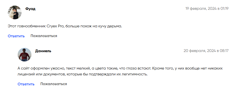 На проект Cryex pro отзывы крайне негативные. По запросам «cryex pro красноярск» или «cryex pro курс», или «Отзывы о работе CRYEX», или «CRYEX REVIEWS» пользователи недовольны качеством работы данной фирмы и обвиняют ее в мошенничестве.