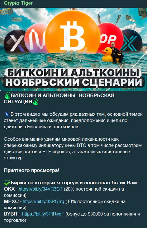 На канале в Телеграмм он размещает анонсы новых видео и того, что в них будет. Плюс он размещает реферальные ссылки на биржи, на которых торгует сам – это Okx, Mexc, Bybit.При регистрации на них пользователь может получить различные бонусы – постоянные скидки на комиссии и денежное вознаграждение до 30 тысяч долларов.