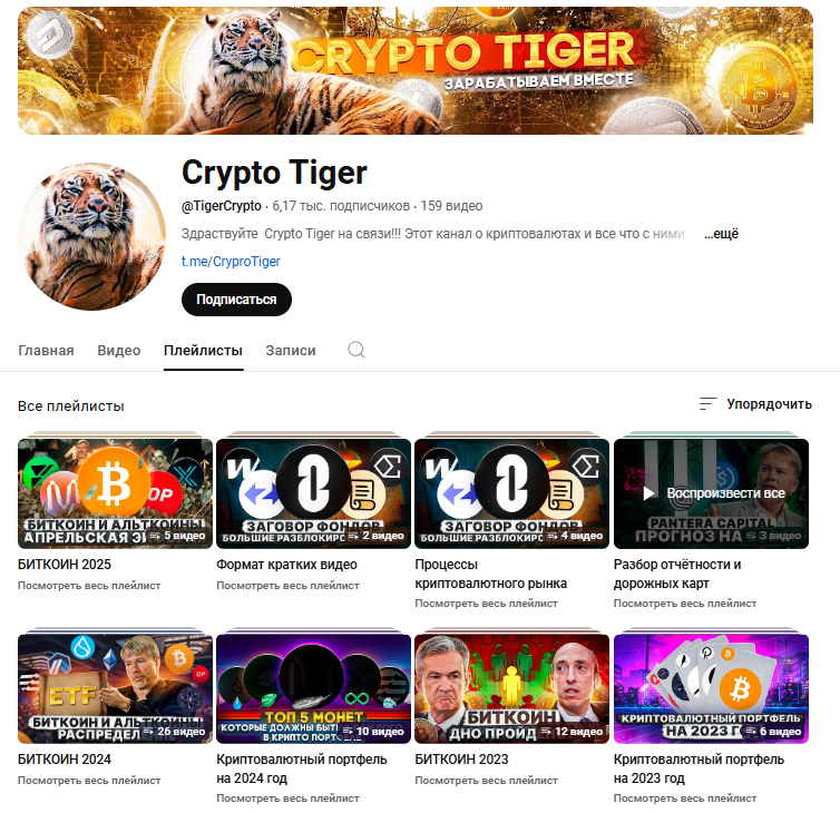 Плюс он ведет свой youtube-канал, на который подписано более 6 тысяч человек. На канале Crypto Tiger почти 160 видео о стратегиях заработка на криптовалюте, о биткоине, об инвестиционном портфеле админа. Все видео разбиты по плейлистам для удобства пользователей.