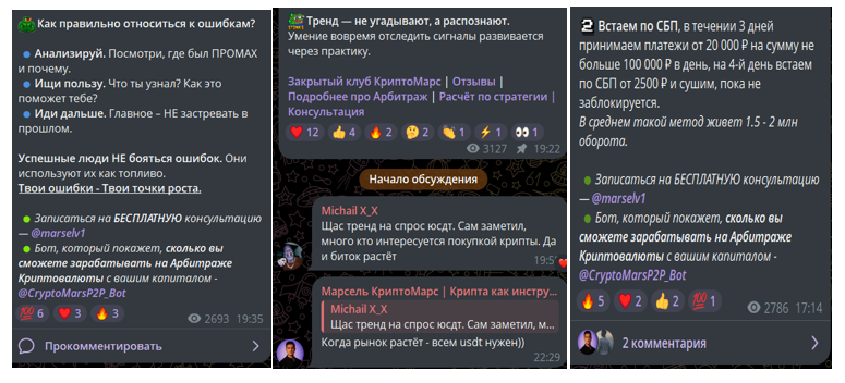 Во многих постах предлагается переход в платный Закрытый клуб КриптоМарс. Пользователям Марсель обещает уникальные обучающие материалы, списки проверенных обменников, рабочие методы защиты, чат для членов комьюнити. Стоимость доступа – 1 тысяча рублей в месяц. Для оплаты советует использовать бот MyHelpMars_bot.