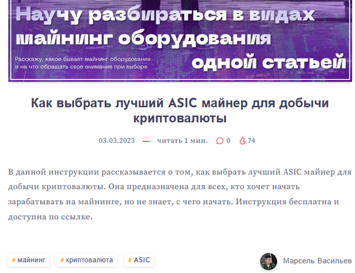 Марсель Криптомарс ведет несколько каналов в социальных сетях. Блог marselv01 userpage org представляет собой информационную страницу, где автор публикует общие статьи. Тут предлагается информация о майнинге, торговле криптой, выборе и работе с ASIC. Часть статей – реклама Школы Марсель КриптоМарс | Крипта как инструмент. Но статьи выкладывались только в феврале-марте 2023 года. С тех пор обновлений не было.