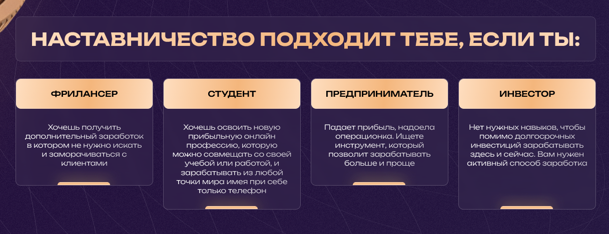 Никакой информации, подтверждающей опыт или результативность работы, Марсель не дает. Указывает только, что количество учеников за год превысило 150, средний доход каждого составляет от 70 тысяч рублей. Обучение предлагает трейдерам с любым уровнем подготовки. Обещает заработок от 3% в день и от 50% в месяц. Среди основных услуг – персональные курсы и наставничество.