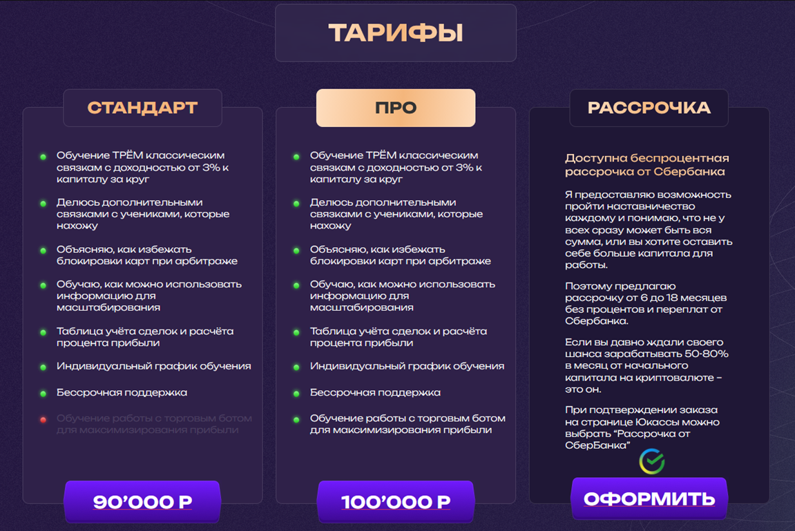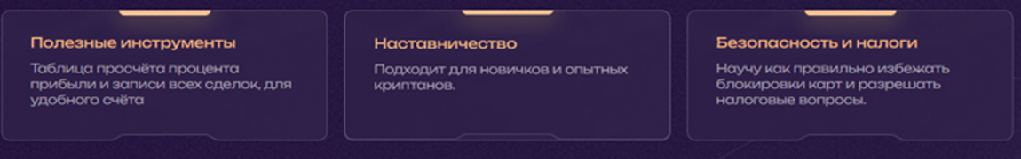 Подробной информации о курсах нет. Даются только общие сведения и громкие обещания получать до 80% дохода на трейдинге, научится работать с таблицами и графиками, решать налоговые споры. Среди заявлений – получение до 100% в месяц на арбитраже. Но никаких подтверждений, статистики или обзоров нет. Ничего не указано о программе курса, длительности, практических занятиях или разборах реальных кейсов.