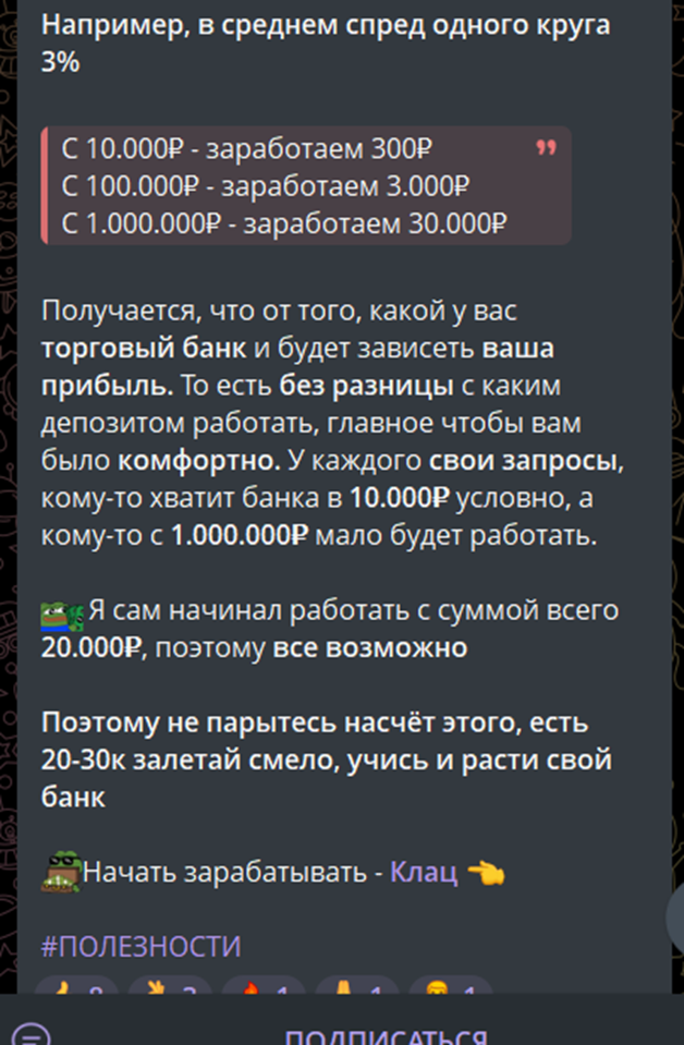 Также на канале присутствует открытая реклама Bybit. Это статьи с признаками агрессивного маркетинга, предложениями перейти и сразу начать торговать, зарабатывая от от 3% на один круг.