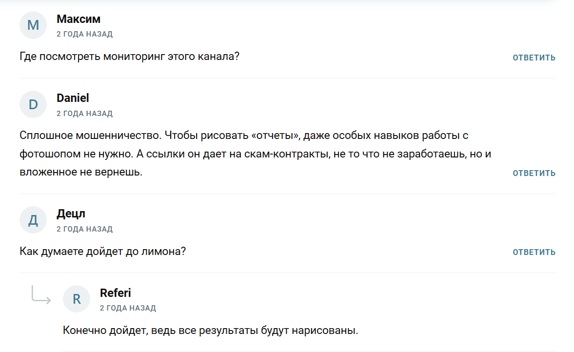 Клиенты отмечают, что автор постоянно повторяет посты, меняет только ссылки на монеты. Подтверждения эффективности его рекомендаций нет.