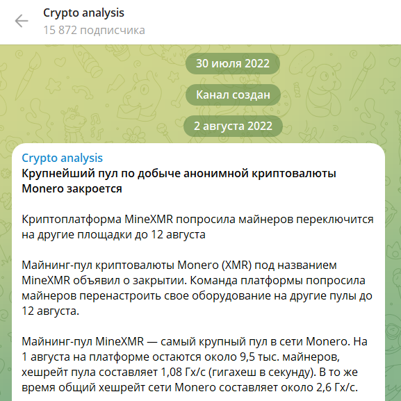 Проект Crypto Analysis работает на платформе Телеграмм. На сегодняшний день число подписчиков составляет 15 872 человека. Однако, число активных пользователей, которые читают контент, в 2-3 раза меньше. Данный факт может говорить об искусственном завышении цифровых показателей.