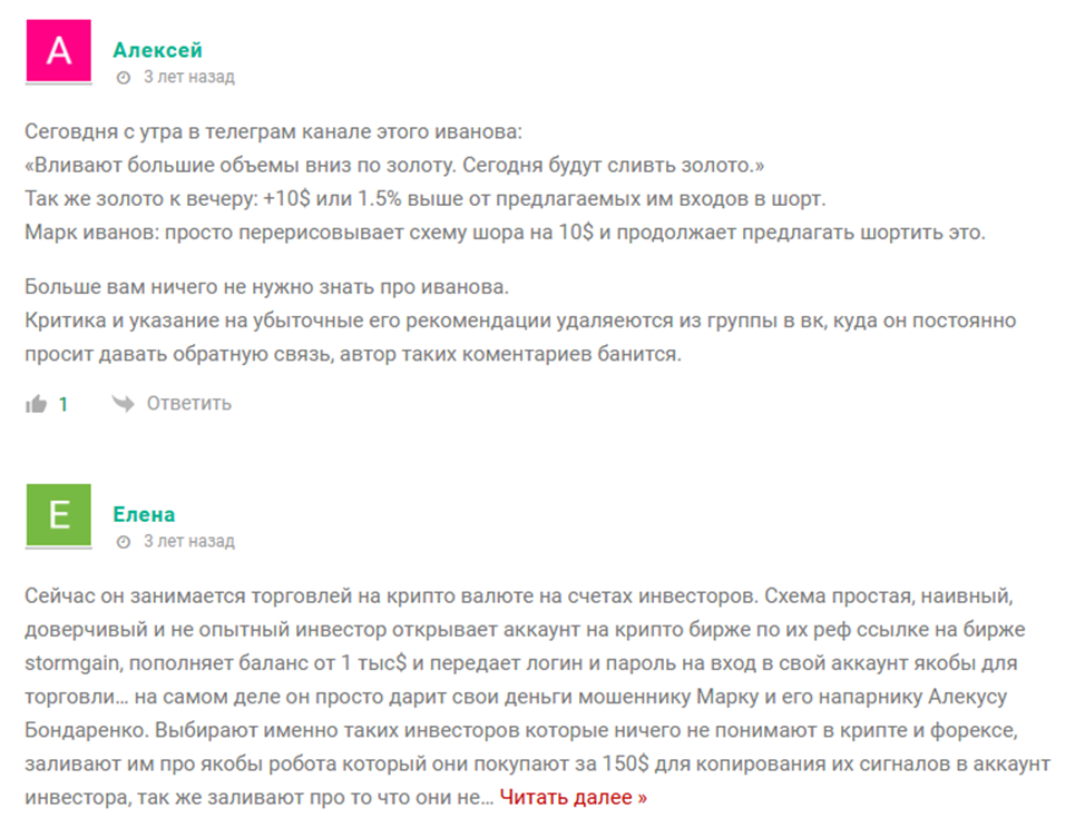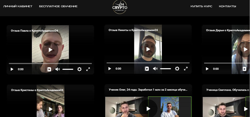 Сайт «Криптоакадемия24» предлагает ознакомиться с отзывами выпускников. Бывшие ученики рассказывают о полезности курсов, якобы Марк Иванов действительно помог им освоить профессию трейдера, выйти на стабильный доход от торговли криптой.