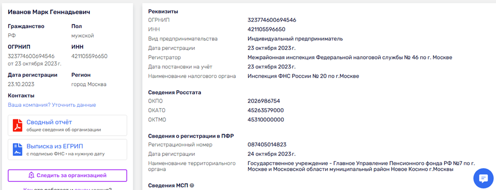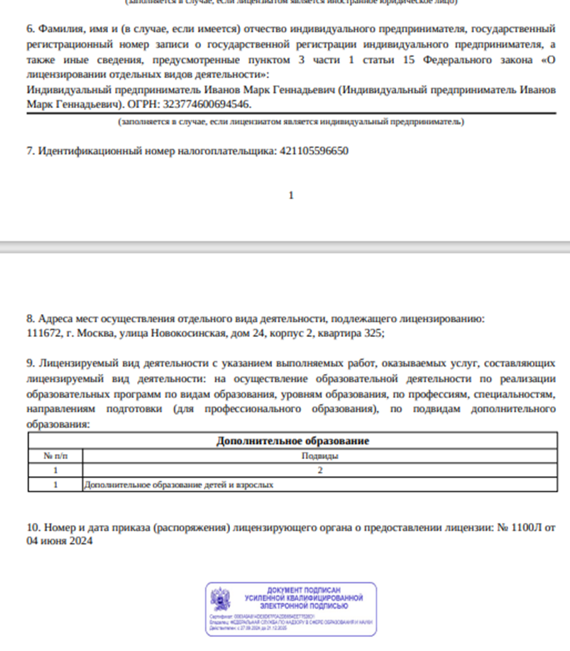 Образовательные услуги под брендом «КриптоАкадемия 24» предоставляет ИП Иванов Марк Геннадьевич. Статус предпринимателя оформлен 23 октября 2023 года, задолго до старта программы «24 Крипто Академия», что соответствует требованиям российского законодательства.
