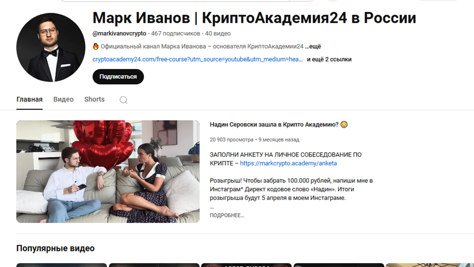 Ютуб-канал Markivanovcrypto имеет всего 467 подписчиков, что указывает на реальную популярность блогера. Топовый ролик набрал 20 тыс. зрителей за счет привлеченной звезды, остальные видео в среднем смотрит менее 500 человек.