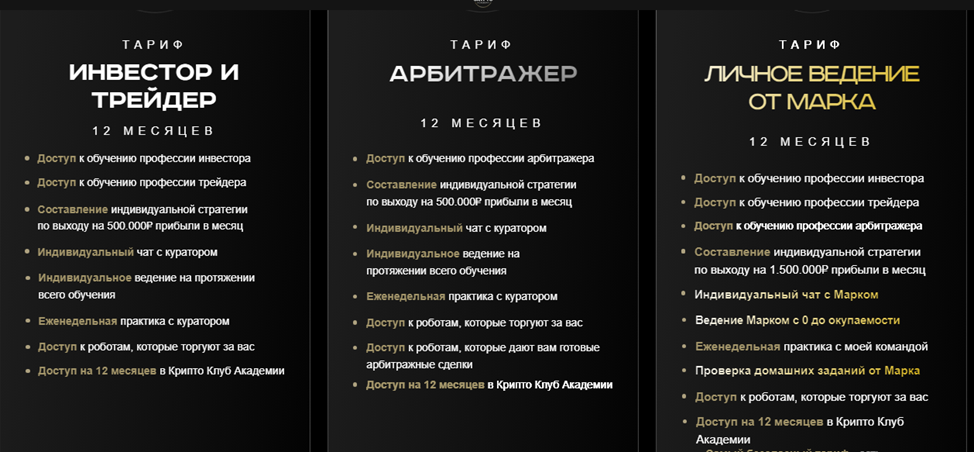3. «Личное ведение от Марка» за 470 тыс. рублей включает прямое взаимодействие с основателем криптоакадемии, а также доступ к услугам по принципу «Все Включено».