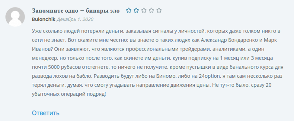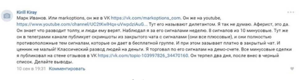 Мнения клиентов о предыдущем проекте Марка Иванова MarkOptions Com также не добавляют плюсов к деловой репутации. Клиенты свидетельствуют, что советы трейдера приносят уверенный минус, реальная статистика не соответствует рекламным обещаниям.