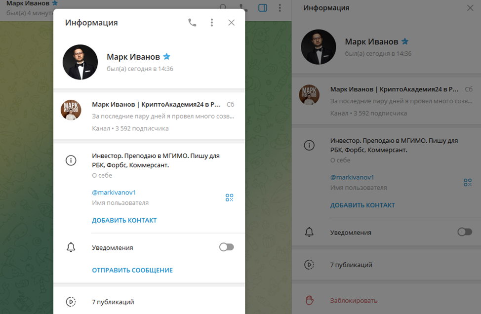 Марк Иванов активно развивает социальные сети, отслеживает все положительные и негативные новости о своей деятельности. Телеграм-канал Markivanovcrypto при 3,5 тыс. подписчиков регулярно читает не более 200 человек, что говорит о низкой востребованности контента, присутствии среди читателей ботов.