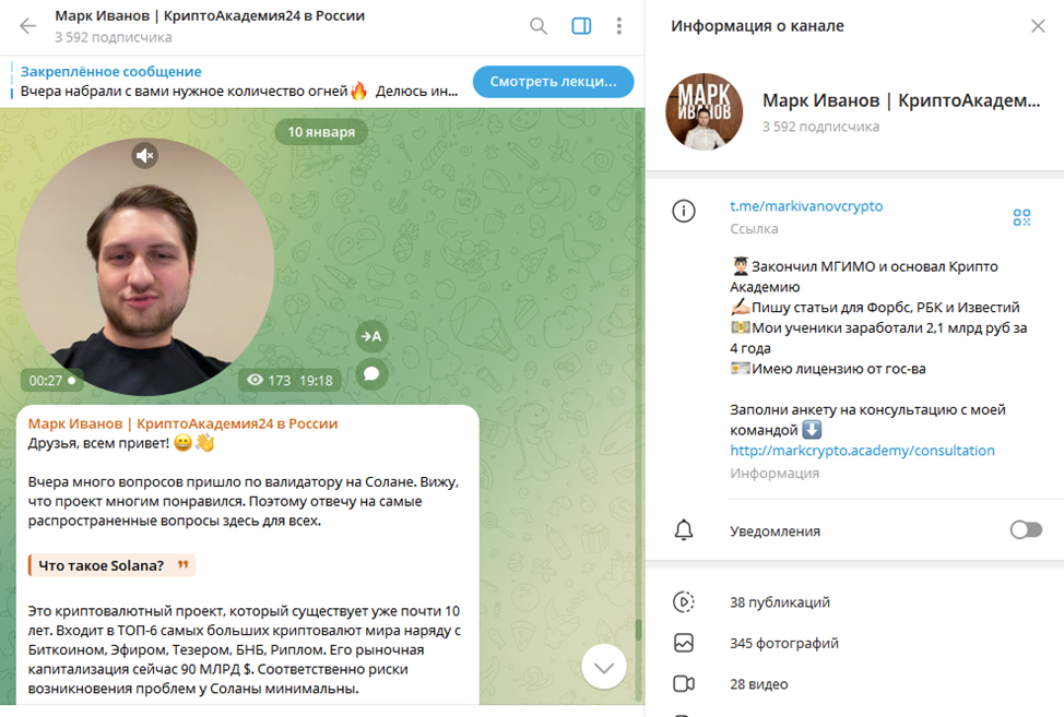 10 января 2025 года наставник «Криптоакадемии24» запустил новую услугу. Своим подписчикам в Тг Марк предлагает платную помощь по созданию и запуску валидатора на Solana, который по его словам поможет получать стабильный доход, требуя минимум инвестиций.