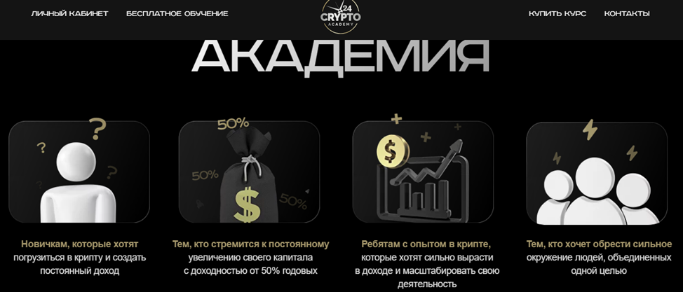 Образовательный проект Cryptoacademy24 com стартовал 6 июля 2024 года, одновременно с запуском официального сайта. Курсы должны помочь освоить популярные криптовалютные профессии и выйти на стабильный ежемесячный доход от 250 тыс. рублей. Программа обучения рассчитана на начинающих трейдеров, делающих первые шаги на бирже. Основной акцент сделан на освоении навыков трейдинга, арбитража, автоматизированных инструментов торговли.