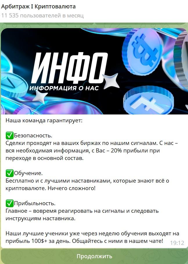 «Арбитраж I Криптовалюта» (Crypto Arbitbot) – телеграм-бот, который привлек уже 11 535 пользователей. При запуске бота выходит сообщение о том, что это закрытое сообщество, члены которого торгуют криптовалютой, зарабатывая на разнице курсов. Участники покупают монеты дешевле, а продают дороже. Сейчас эта группа трейдеров якобы ищет новых людей в свою команду. Если нет опыта, владельцы обещают бесплатное обучение, после которого допустят к трейдингу с остальными членами.