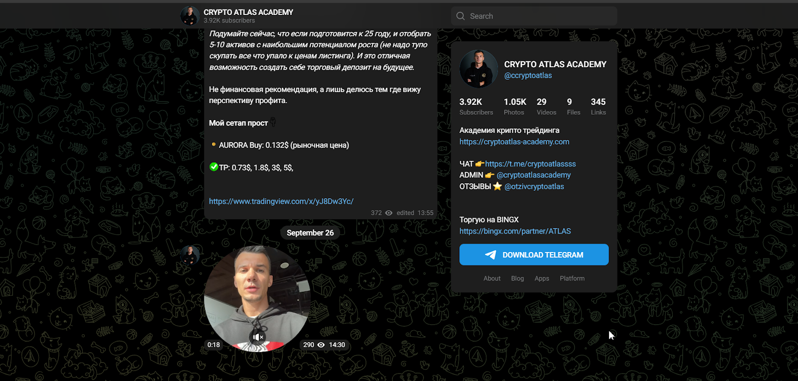 Crypto atlas – телеграмм канал с 4000 подписчиков. Автор позиционирует проект как образовательный, обещая помочь разобраться в особенностях торговли криптовалютой новичкам и более опытным инвесторам. Трейдер оставляет ссылку на академию Ccryptoatlas и прайс-лист по доступным курсам. В этой статье разберемся, насколько перспективно вкладывать деньги в обучение.