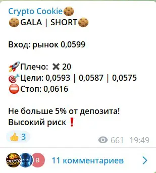 Crypto Cookie – это канал в Телеграме, посвященный заработку на криптовалютах. Его ведет трейдер Kiop Crypto. Помимо основного автора, в ленте есть еще менеджер Fladdyx и администратор Crypton From Paradise (@cryparadise). Спекулянт публикует сигналы на токены, указывает плечо и стоп-лосс. Но аналитику не публикует.