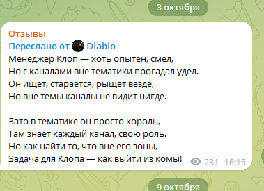 На момент проведения нашей проверки Телеграм-ресурс Crypto Cookie удален, но личный чат Kiop Crypto функционирует. В описании этого ресурса осталась ссылка на канал с отзывами о различных возможностях заработка онлайн. Там какой-то анонимный пользователь в одном сообщении хвалил автора Crypto Cookie за успешную рекламу. В теории, пользователи должны поверить этому подписчику на слово о том, что Kiop Crypto стоит доверять.