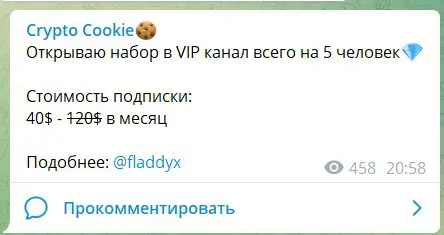 У трейдера есть вип-чат, стоимость доступа в него составляет $40. Раньше спекулянт продавал эту услугу за $120. Но видно, что она не пользовалась спросом у подписчиков. Иначе он был не стал делать скидку в 70%.