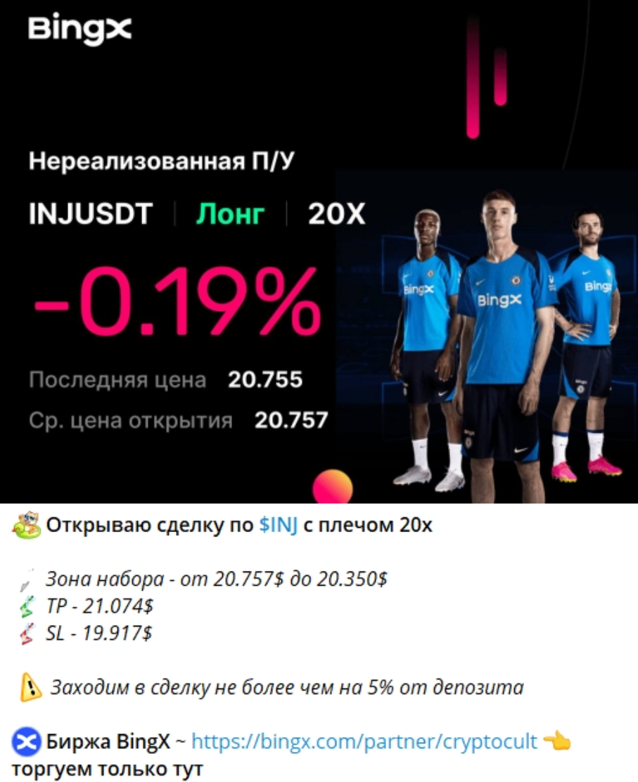 Несмотря на бесплатность приведенной информации, говорить о полной безопасности для клиентов Телеграм-канала Crypto Cult не приходится. Герой материала активно заманивает перспективой выгодных сделок и получения быстрого заработка. При этом он активно зазывает клиентов переходить на биржу BingX и работать именно там.