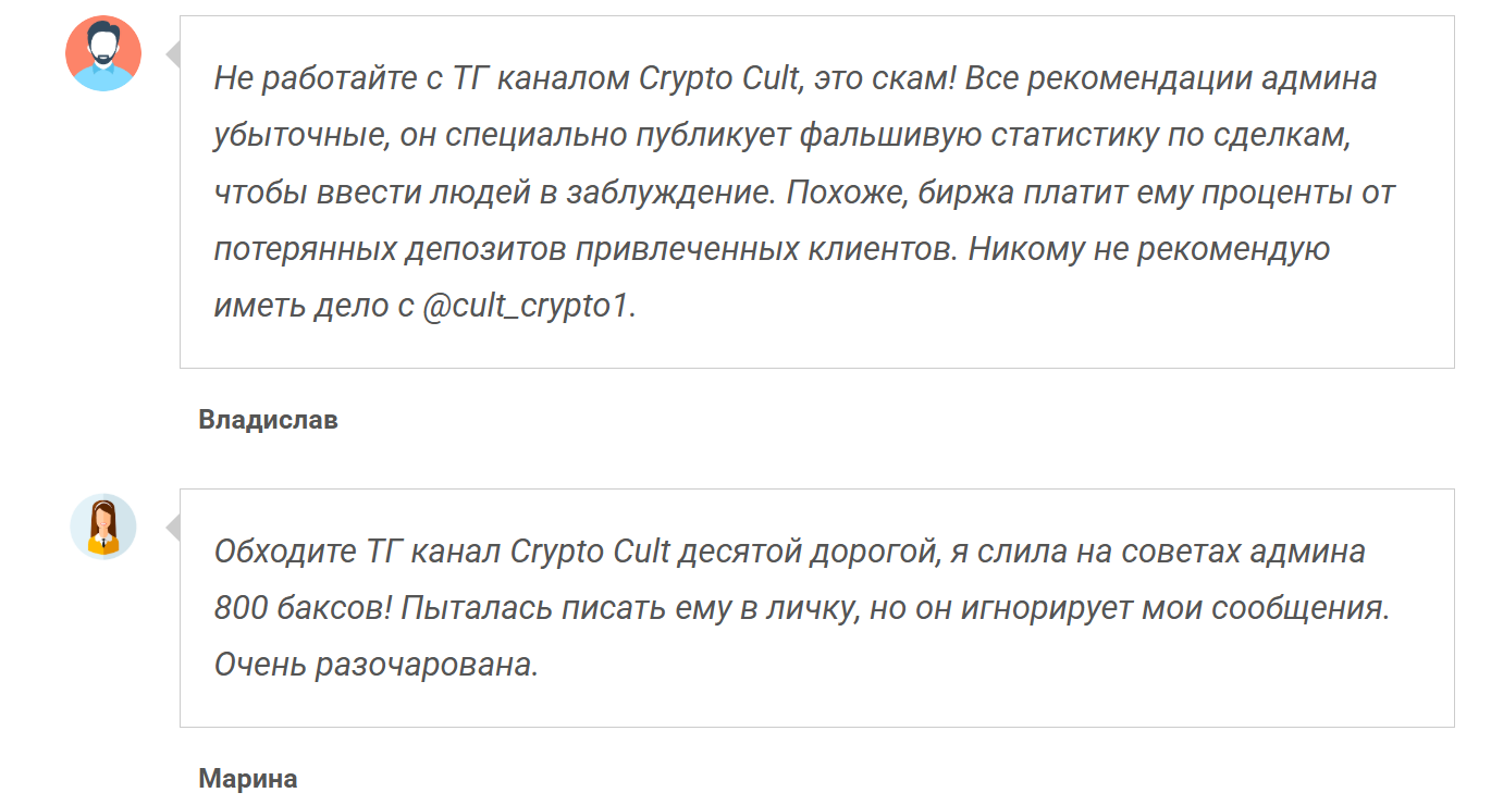 Несмотря на более чем годовую работу канала, отзывов о Cult Crypto1 немного. В тех же комментариях, что встречаются, клиенты не рекомендуют работать с каналом. Некоторые и вовсе отмечают, что проект является СКАМом. Пользователи жалуются на поддельную статистику и высокие риски слива депозита.