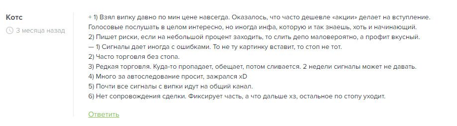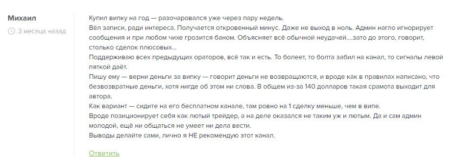 Пользователи, которые оплатили обучение у финансиста, заявляют, что зря потратили свои деньги и время. Уникальные курсы оказались стандартным набором заранее записанных видеуроков с давно устаревшей информацией. Еще одна проблема, на которую жалуются подписчики Телеграм-канала – низкая проходимость сигналов, которая явно не дотягивает до 90%, обещанных финансистом.