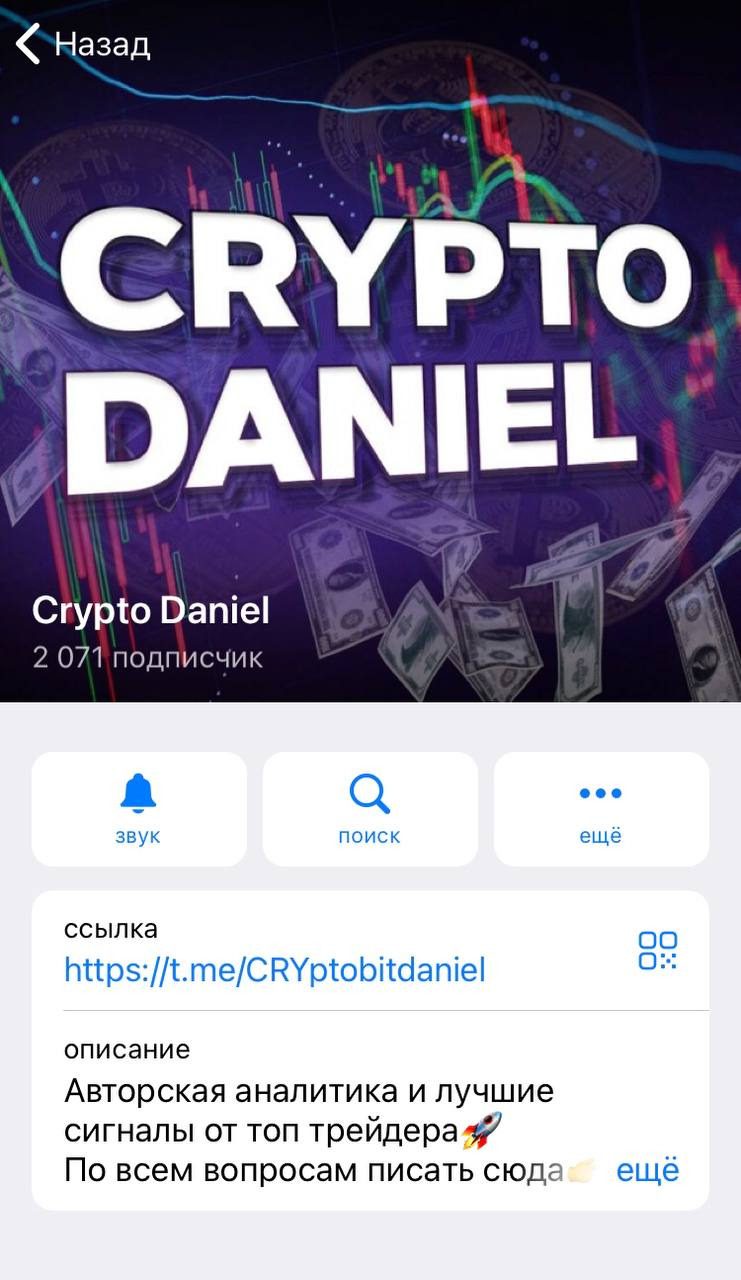 Крипто Даниэль – Телеграм-канал анонимного трейдера, на котором подписчикам предлагается обучение, бесплатные сигналы по криптовалютам и аналитика. Финансист утверждает, что за 11 месяцев смог заработать солидный капитал и сформировал беспроигрышную стратегию стабильной работы.