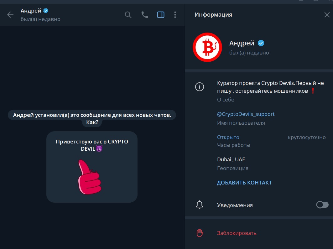 Андрей — куратор проекта, в личном профиле под ником CryptoDevils Support, обещает отвечать на сообщения и не писать первым. Он заявляет, что: