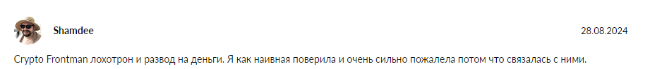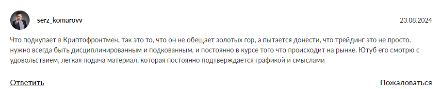 - У Cryptofrontman есть некоторые позитивные отзывы о информации с его Ютуб-канала, однако куда больше негатива и обвинений в разводе и кидалове с его стороны, следовательно, некоторые люди уже потеряли деньги и есть риск уйти в убыток, пользуясь предложениями автора.