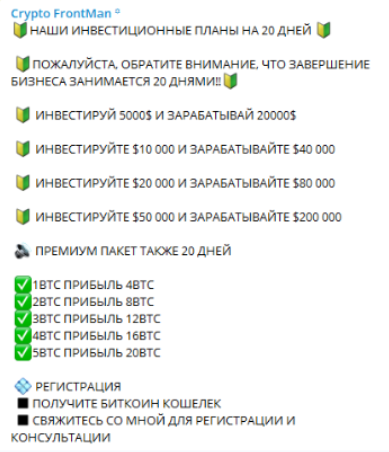 Crypto FrontMan предлагает раскрутку счета инвестора через обычный и премиум пакет. Депозит составляет от 1 до 5 биткоинов, а заработать от инвестиции можно от 4 до 20 биткоинов соответственно.