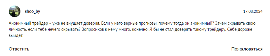 Сомнения у людей вызывает также и анонимность трейдера.