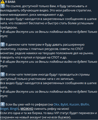 Также у автор есть закрытый не бесплатный телеграмм-канал, доступ в который после регистрации по реферальным ссылкам на финансовые платформы, где нужно торговать криптовалютой.