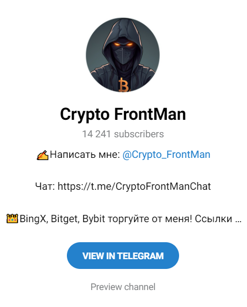 Трейдер Cryptofrontman открыл свой канал в 2021 году. Там он рекламирует свой Ютуб, пишет различные обзоры на криптовалюты и ситуацию на рынке. Множество постов «Фронтмена» носит чисто информационный характер, советы какую крипту покупать и продавать.