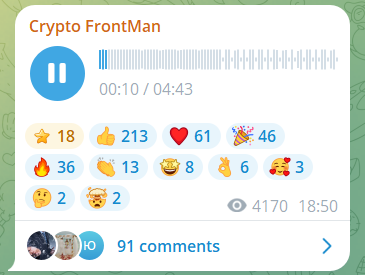 В Чат Crypto Frontman Crypto автор иногда записывает сообщения, которые стабильно просматривают и прослушивают тысячи человек. Многие ставят реакции и пишут комментарии. Аудитория трейдера выглядит активной.