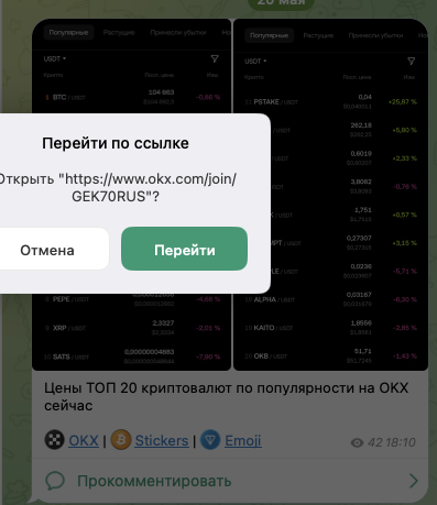 Многие публикации на телеграм-канале дополнены ссылкой на криптовалютную биржу OKX. В нее зашит реферальный код.