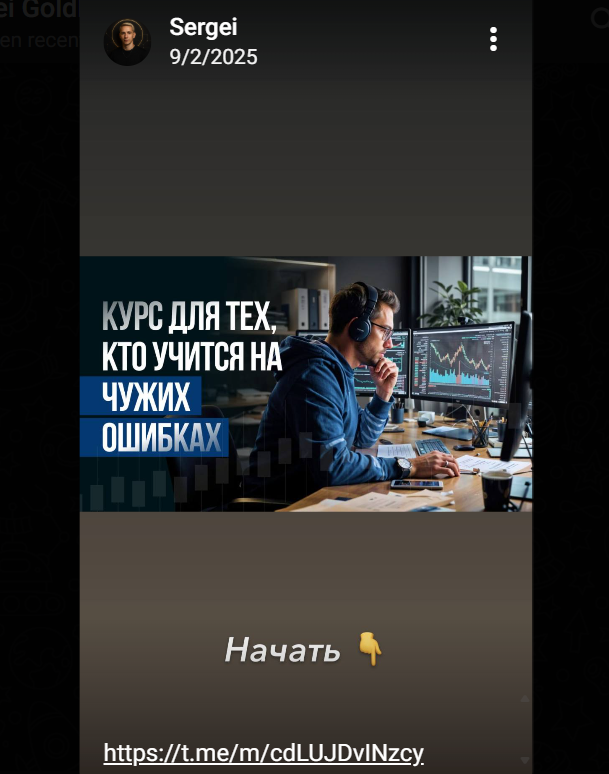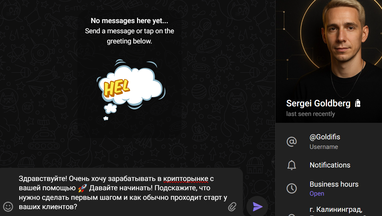 В личном аккаунте Сергея есть ссылка с готовым обращением, в котором клиент “очень хочет зарабатывать в крипторынке” и обращается с просьбой подсказать как сделать первые шаги к сотрудничеству.