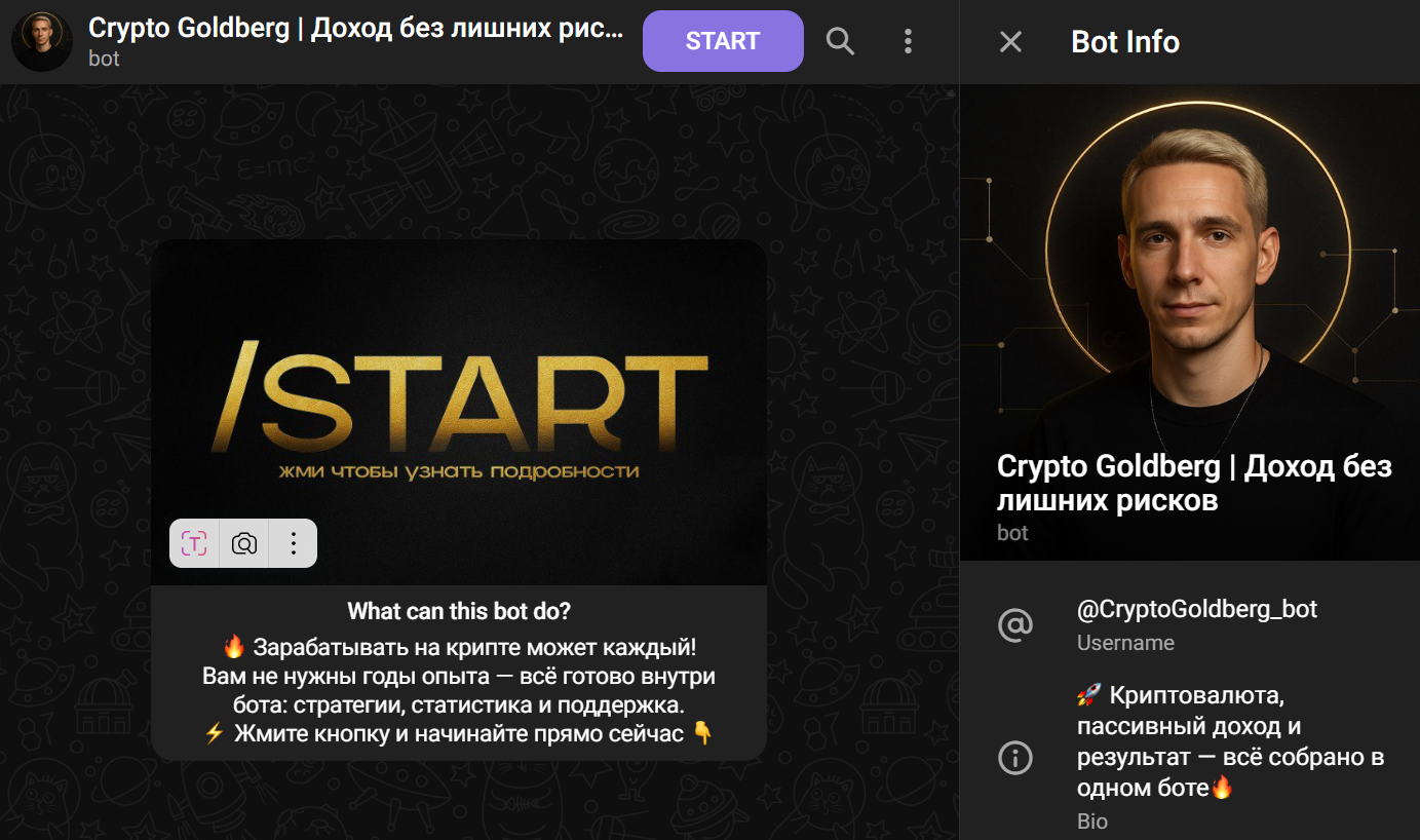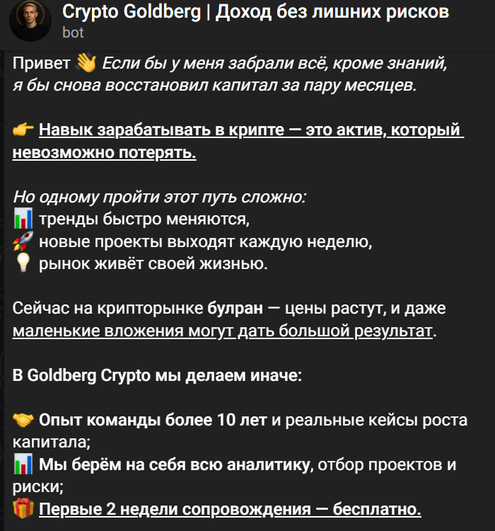 В сообщениях бота Crypto Goldberg Доход без лишних рисков руководитель проекта утверждает, что его команда более 10 лет оказывает помощь клиентам и помогает работать на крипторынке “безопасно и прибыльно”. Двухнедельное сопровождение предоставляется бесплатно. Своей целью команда якобы ставит приумножение капиталов всех юзеров, которые к ним обратились, даже новичков без опыта торговли на рынке криптовалют.