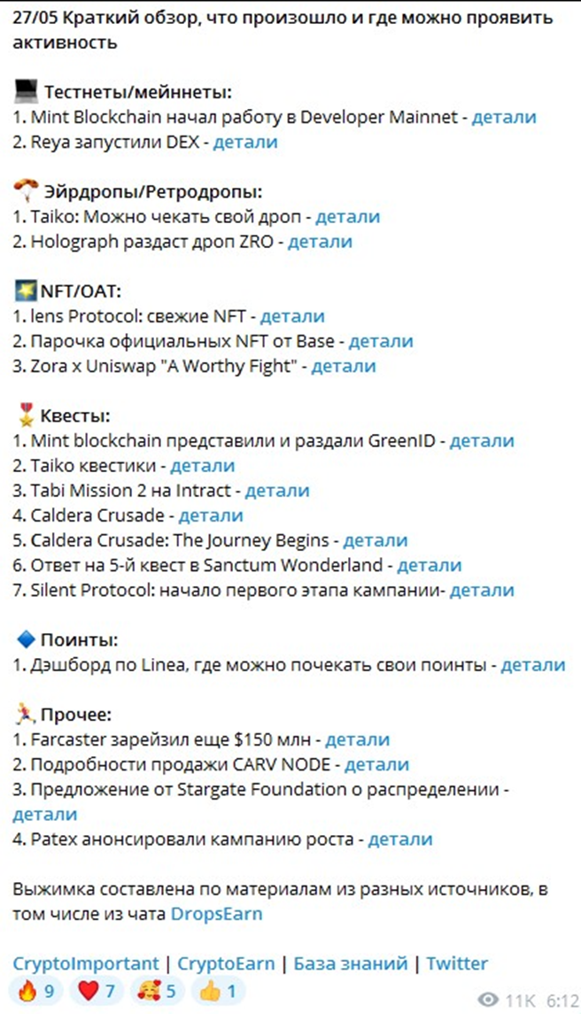 У проекта есть дополнительный достаточно развитый телеграмм-канал. Он называется Crypto Important. Тут на ноябрь 2024 года – 9 288 подписчиков. Темы публикаций примерно такие же, как и в основном сообществе. Несмотря на меньшее количество аудитории, просмотров на посты тут больше. Некоторые публикации могут набирать более 11 тысяч просмотров, что превышает количество подписчиков и результаты основного канала.